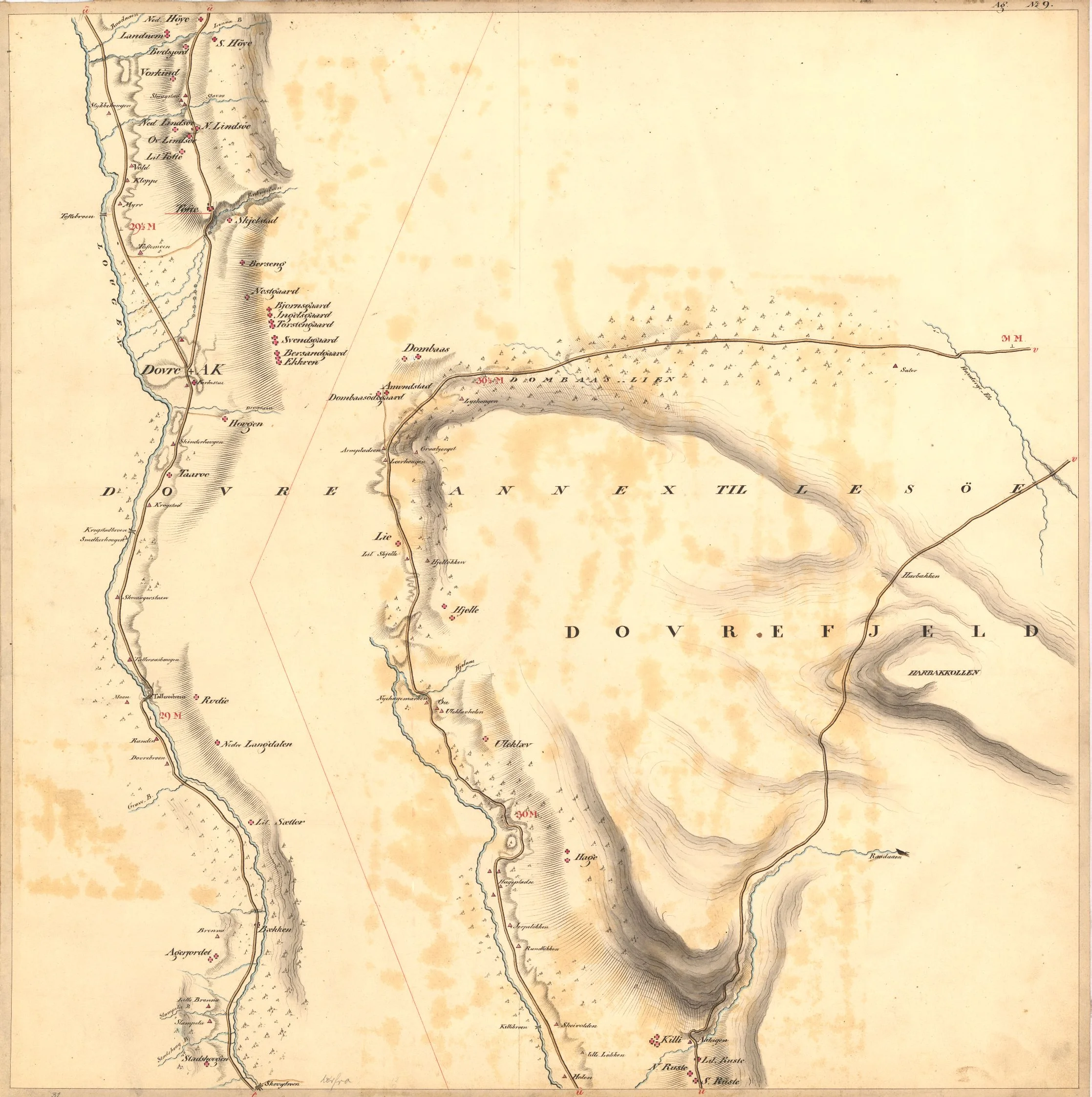 Kartet fra 1820 viser den nye vegtraséen om Dombås og den gamle Kongevegen ved Dovre og over Hardbakken.Kilde: Kartverket, Norge 240 kartblad nr. 9, Reichborn 1820